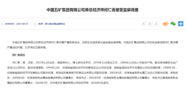 中国网8月7日讯 据湖北省纪委监委官网消息,中国五矿集团有限公司原总经济师何仁春涉嫌严重职务违法,目前正在接受湖北省监委监察调查。