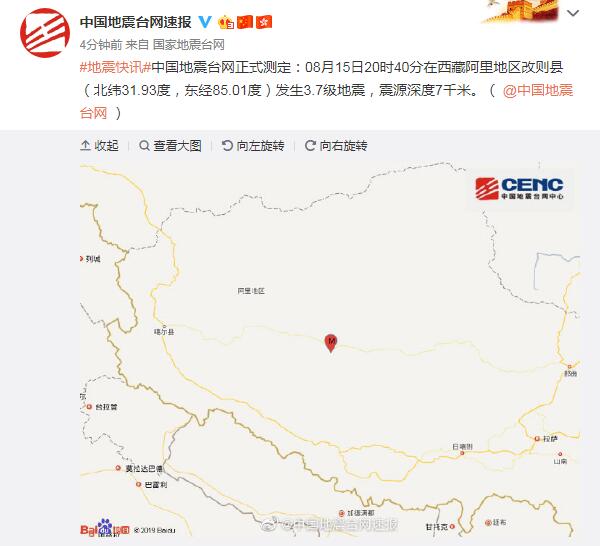 中国网8月15日讯 据中国地震台网消息,中国地震台网正式测定,8月15日20时40分在西藏阿里地区改则县(北纬31.93度,东经85.01度)发生3.7级地震,震源深度7千米。