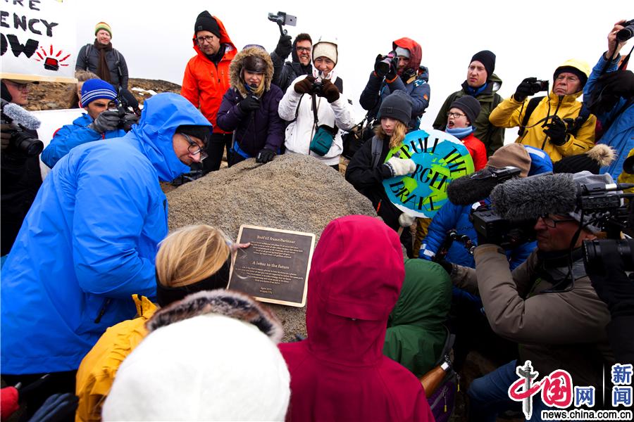 当地时间2019年8月18日,冰岛奥克冰川遗址,当地举行追悼会,纪念国内因气候变暖消失的第一座冰川。科学家警告说,冰岛其他冰川也可能面临相同命运。epa/IC photo