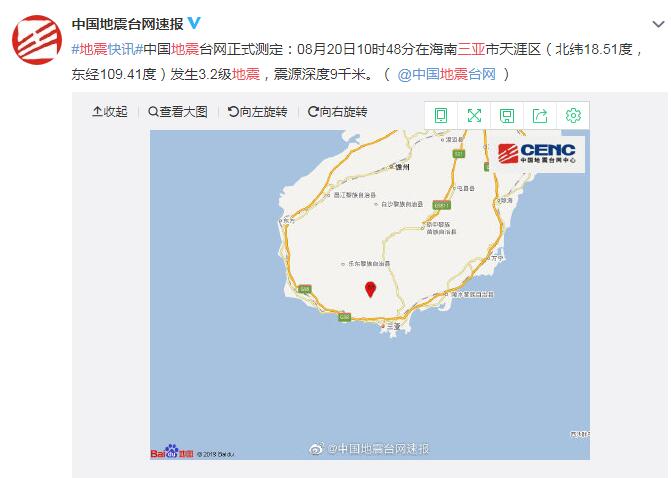 中国网8月20日讯 据中国地震台网消息,中国地震台网正式测定:8月20日10时48分在海南三亚市天涯区(北纬18.51度,东经109.41度)发生3.2级地震,震源深度9千米。