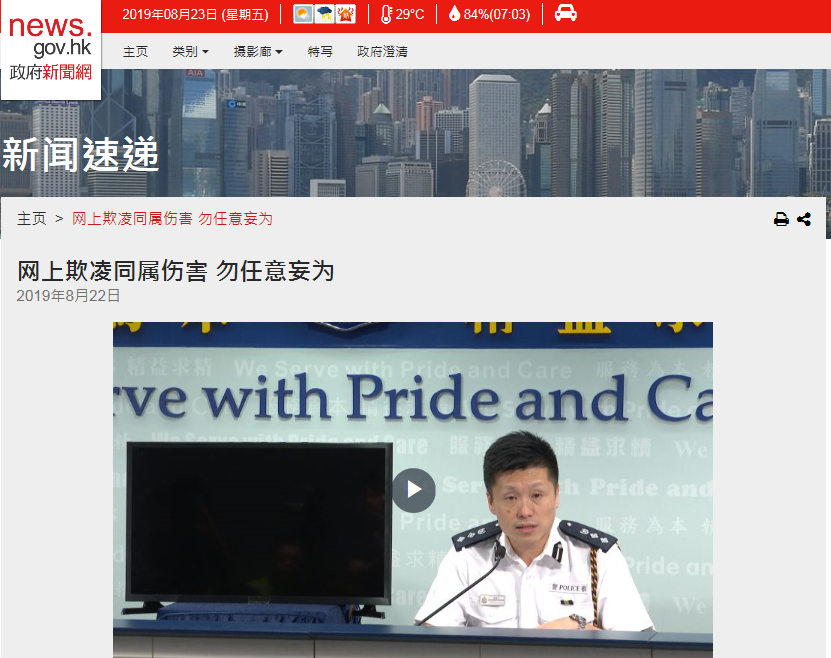 中国网8月23日讯 据香港特别行政区政府新闻网消息,针对“近期网上出现的煽动他人进行暴力行为的言论和网上欺凌事件”,香港警察公共关系科总警司谢振中在22日的警方记者会上表示,无论巿民有何诉求,都不能诉诸暴力。