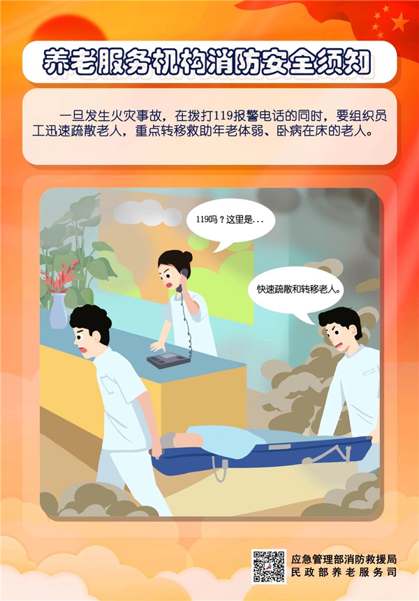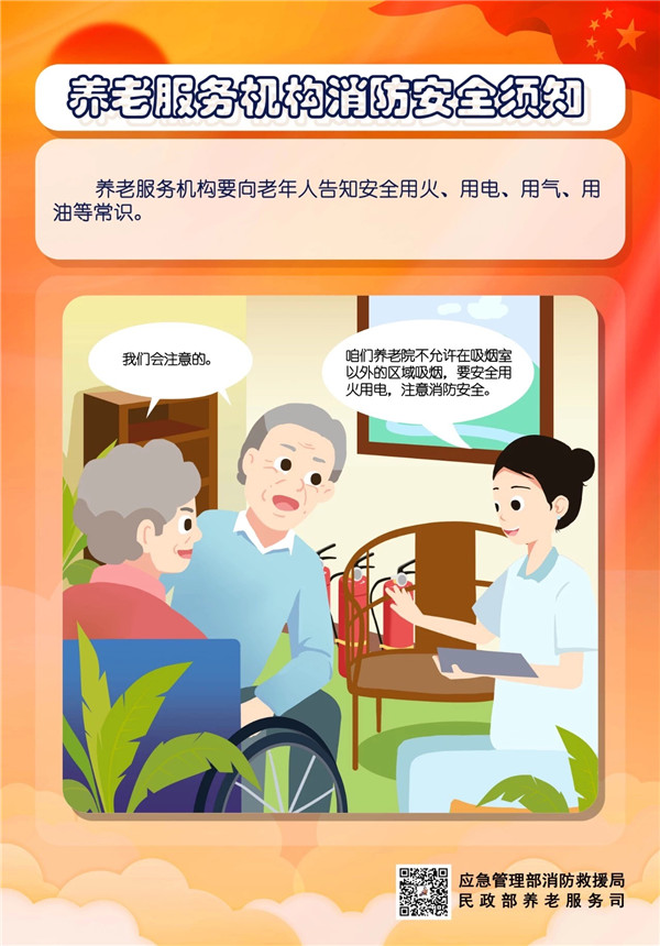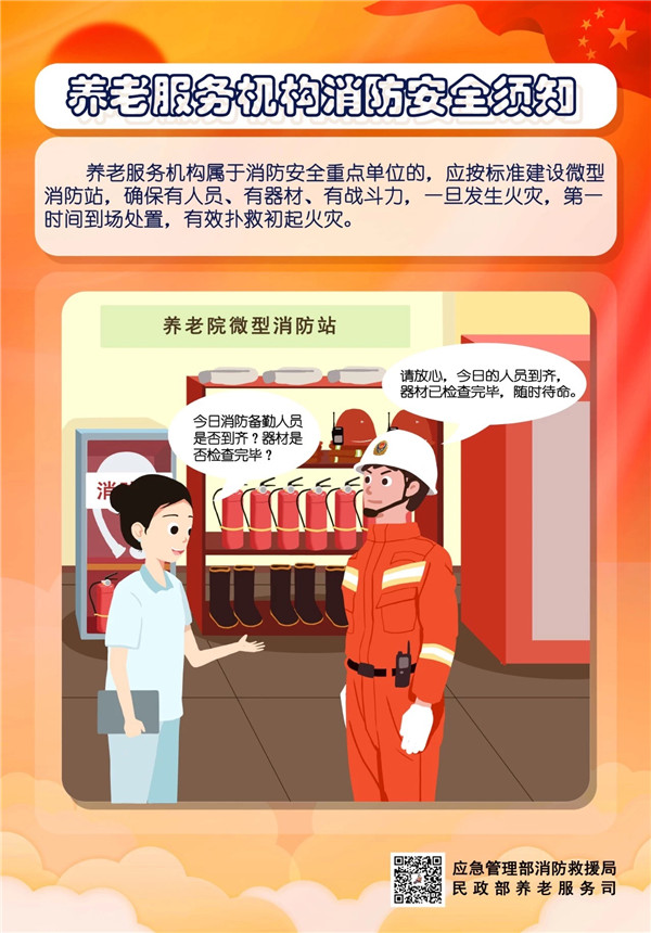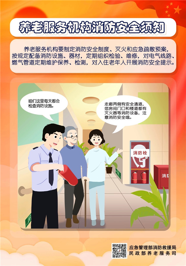 同时,应急管理部消防救援局还联合民政部养老服务司组织设计了“养老服务机构消防安全须知”系列挂图,要求各地消防救援机构、民政部门在养老福利机构广泛张贴。