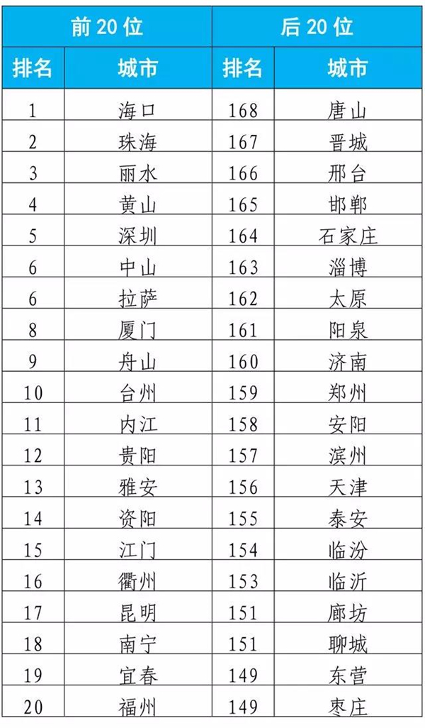 7月168个重点城市排名前20位和后20位城市名单。图表来源:生态环境部