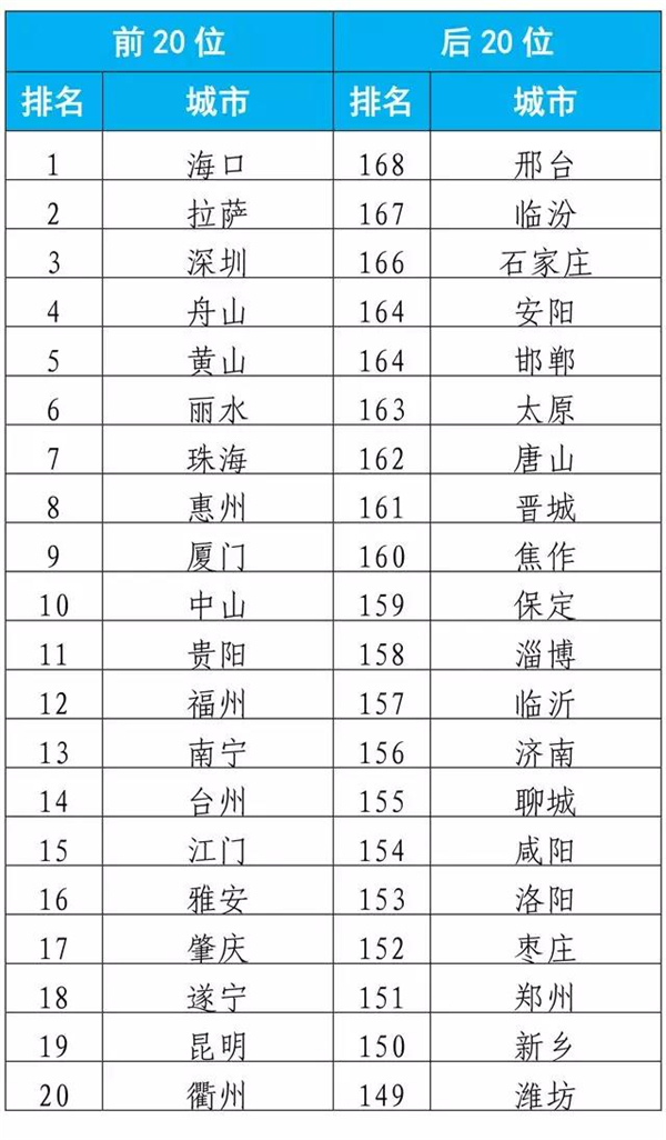 1-7月,168个重点城市中邢台、临汾、石家庄市等20个城市空气质量相对较差(从第168名到第149名);海口、拉萨、深圳市等20个城市空气质量相对较好。