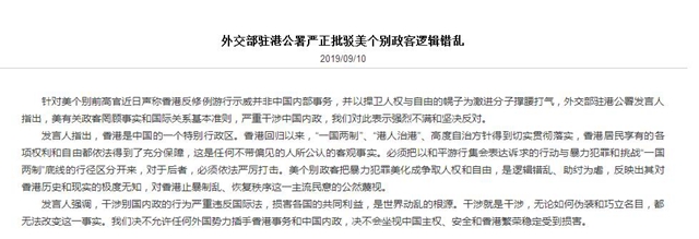 中国网9月10日讯 据中华人民共和国外交部驻香港特别行政区特派员公署网站(以下简称“外交部驻港公署”)消息,针对美个别前高官近日声称香港反修例游行示威并非中国内部事务,并以捍卫人权与自由的幌子为激进分子撑腰打气,外交部驻港公署发言人今日指出,美有关政客罔顾事实和国际关系基本准则,严重干涉中国内政,中方对此表示强烈不满和坚决反对。