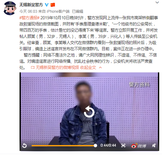 通报称,2019年10月10日晚8时许,警方发现网上流传一张我市高架桥侧翻事故救援现场的微信截图,并附有“手表是理查德米勒”、“一个地级市的公安局长,带四百万的手表,估计是忙的没记得摘下来”等谣言。警方立即开展工作,并将发帖人顾某(男,32岁,无锡人)、李某(男,39岁,兴化人)等人传唤至公安机关。经审查,顾某、李某等人交代在微信群内看到一张救援现场的照片后,为吸引眼球,编造上述谣言并发布在不同微信群内。目前,案件正在进一步办理中。