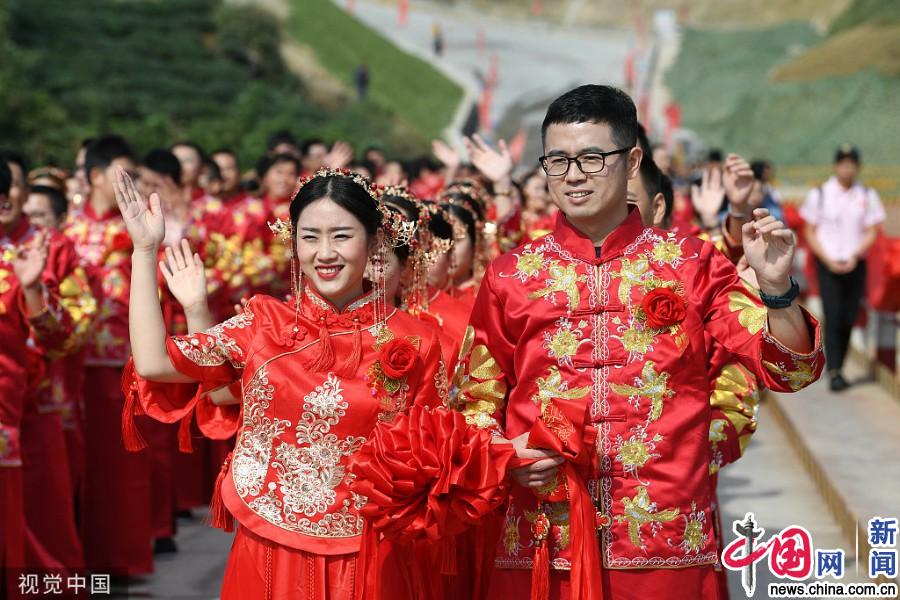 10月16日,安徽黄山,新人们在中铁四局承建的(南)昌景(德镇)黄(山)高铁施工现场参加集体婚礼。张大岗/视觉中国