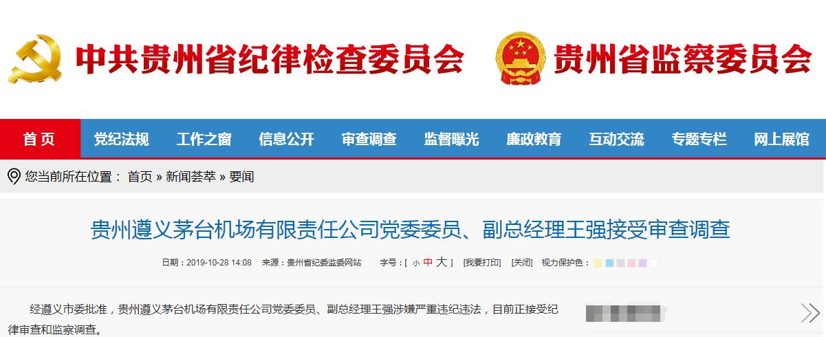 中国网10月28日讯 据贵州省纪委监委网站消息,日前,经遵义市委批准,贵州遵义茅台机场有限责任公司党委委员、副总经理王强涉嫌严重违纪违法,目前正接受纪律审查和监察调查。