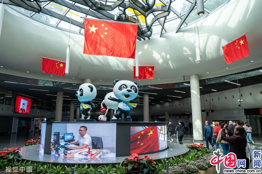 2019年10月29日,进博会吉祥物“进宝”雕塑亮相上海市人民广场地铁站换乘大厅,雕塑中两只可爱的“熊猫”手持“四叶草”站在高处笑迎四方,吸引了不少市民驻足拍照。王冈/视觉中国
