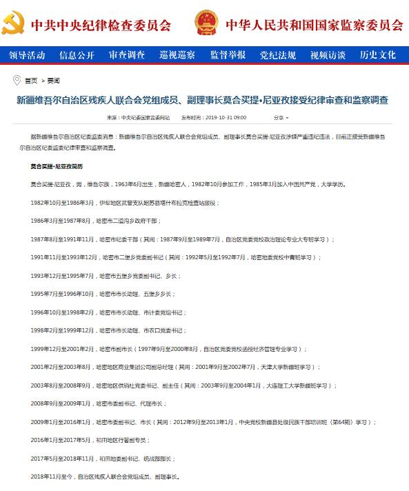 中国网10月31日讯 据中央纪委国家监委网站消息,新疆维吾尔自治区残疾人联合会党组成员、副理事长莫合买提·尼亚孜、新疆伊犁河流域开发建设管理局党委委员、副局长李鹏涉嫌严重违纪违法,目前正接受新疆维吾尔自治区纪委监委纪律审查和监察调查。
