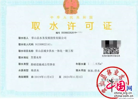 中国网11月7日讯(记者 张艳玲)11月4日,浙江省衢州市常山县水务发展投资有限公司在市行政服务中心领取了全国首张取水许可电子证照,这是水利系统首个实现电子证照管理的行政许可事项,标志着全国取水许可电子证照应用推广实现重大突破。