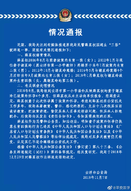 通报称,薛某权作为民警和公务员,知法违法,明知妻子政策外怀孕仍执意生育四孩的行为已违反《中华人民共和国人口与计划生育法》《广东省人口与计划生育条例》《中华人民共和国公务员法》以及《中华人民共和国人民警察法》等法律法规规定,该局对其多次教育仍无转变,认定其已不适合继续在公安机关工作。根据《中华人民共和国公务员法》(修订前) 第八十三条、《公务员辞退规定(试行)》第四条等规定,经反复研究,该局于2018年12月29日对薛某权作出辞退处理的决定。