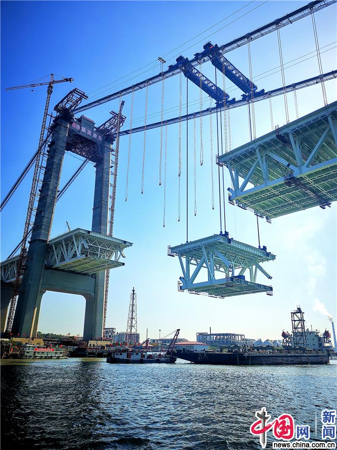 五峰山长江大桥中跨第31个大节段钢梁架设。中国网发 张耀军/摄
