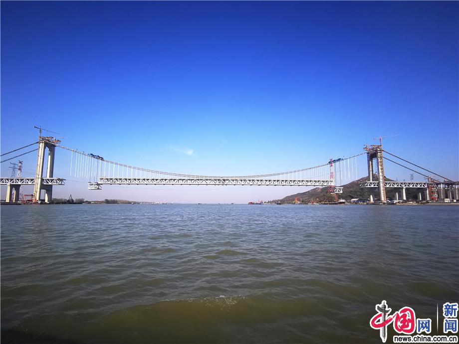 五峰山长江大桥中跨钢梁架设。中国网发 张耀军/摄