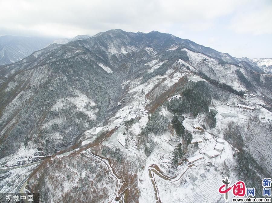2019年11月25日,西安,蓝田县辋川镇前梁村,航拍雪后秦岭。袁景智/视觉中国