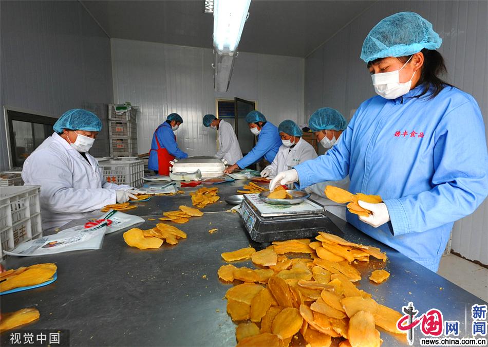 2019年12月7日,山东枣庄,山亭区徐庄镇一家农产品加工企业的工人在包装地瓜干,准备外销。李宗宪/视觉中国