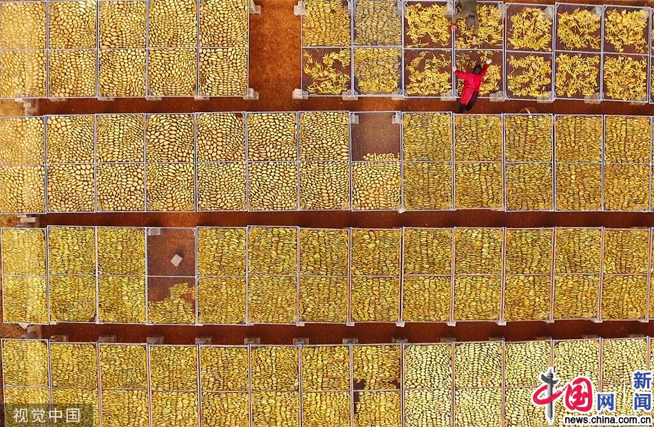 2019年12月6日,山东枣庄,山亭区水泉镇倪山口村农民晾晒地瓜干。李宗宪/视觉中国