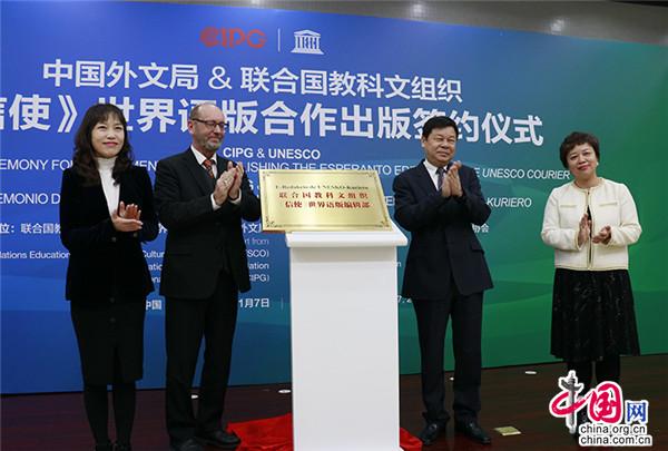 1月7日,中国外文局局长杜占元与联合国教科文组织品牌与出版总监伊恩·丹尼森共同为《信使》世界语编辑部揭牌。中国网 彭瑶 摄