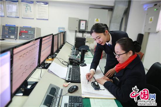 客运值班员刘佩晗在客运声场指挥室与综控员核对第二天的编组情况,保证旅客的顺利出行。苏志刚 摄