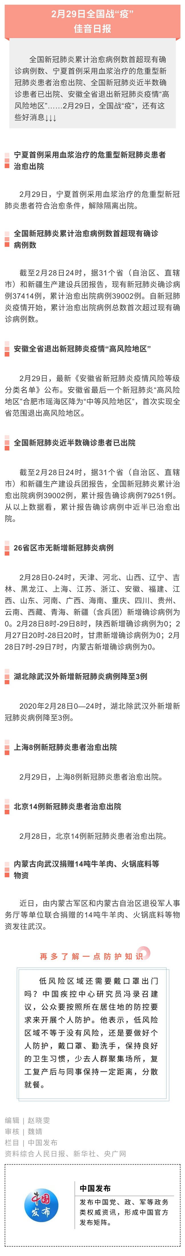 中国发布丨2月29日佳音日报:全国新冠肺炎近半数确诊患者已出院、宁夏首例采用血浆治疗的危重型患者治愈出院