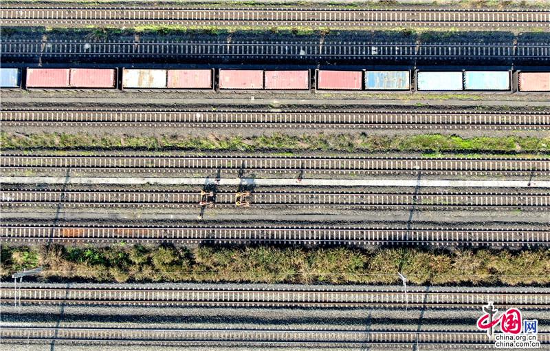 重庆工务段兴隆场线路车间的职工对中欧班列编组场内的设施进行检查。航拍 喻雪峰