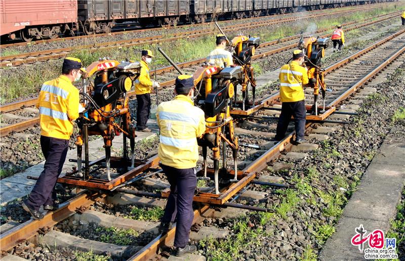 重庆工务段兴隆场线路车间的职工对中欧班列编组场内的设施进行检查。航拍 喻雪峰