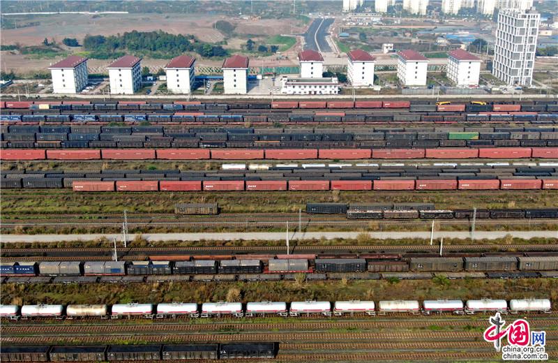 重庆工务段兴隆场线路车间的职工对中欧班列编组场内的设施进行检查。航拍 喻雪峰