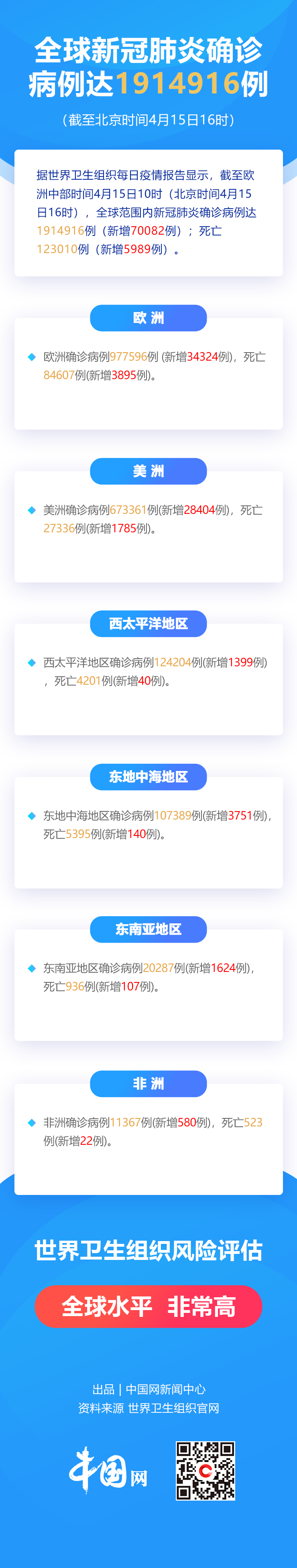 中国网4月16日讯 据世界卫生组织每日疫情报告显示,截至欧洲中部时间4月15日10时(北京时间4月15日16时),全球范围内新冠肺炎确诊病例达1914916例,新增70082例;死亡123010例,新增5989例。