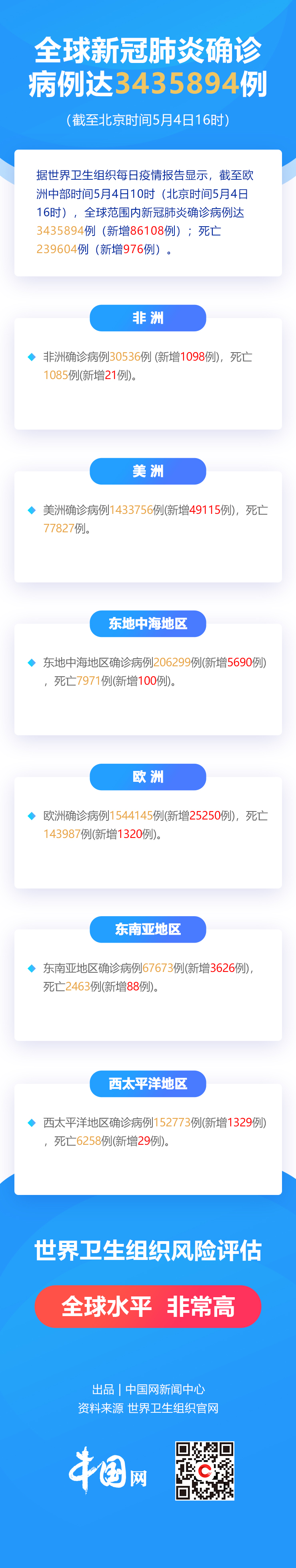 中国网5月5日讯 据世界卫生组织每日疫情报告显示,截至欧洲中部时间5月4日10时(北京时间5月4日16时),全球范围内新冠肺炎确诊病例达3435894例,新增86108例;死亡239604例,新增976例。
