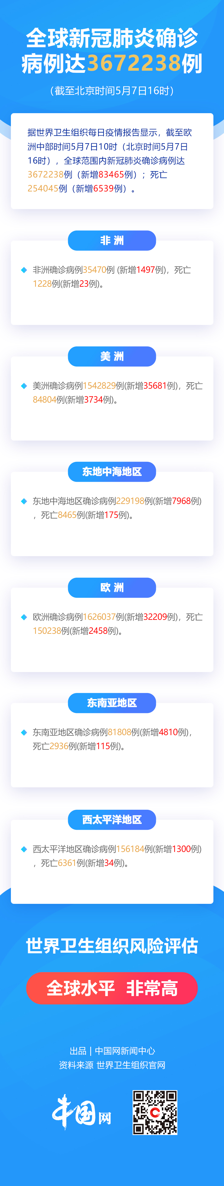 中国网5月8日讯 据世界卫生组织每日疫情报告显示,截至欧洲中部时间5月7日10时(北京时间5月7日16时),全球范围内新冠肺炎确诊病例达3672238例,新增83465例;死亡254045例,新增6539例。