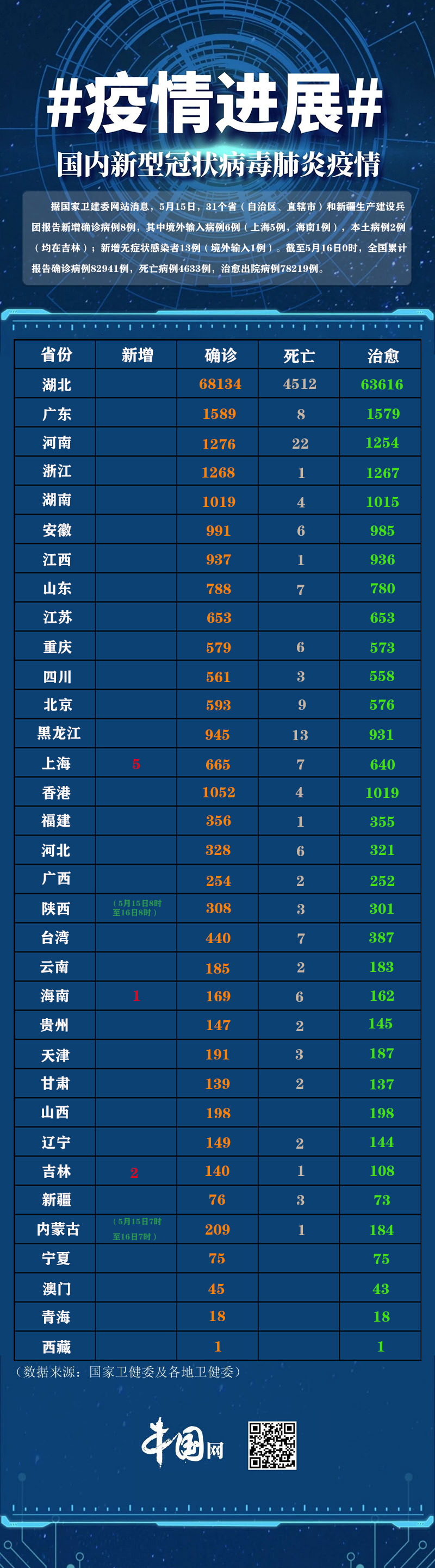 据国家卫健委网站消息,5月15日,31个省(自治区、直辖市)和新疆生产建设兵团报告新增确诊病例8例,其中境外输入病例6例(上海5例,海南1例),本土病例2例(均在吉林);新增无症状感染者13例(境外输入1例)。截至5月16日0时,全国累计报告确诊病例82941例,死亡病例4633例,治愈出院病例78219例。