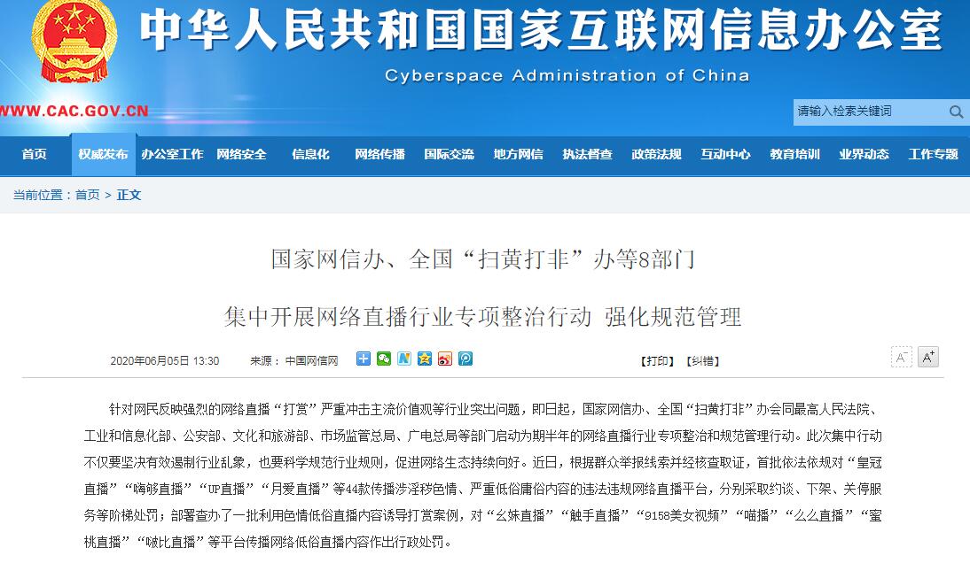 中国网6月5日讯 针对网民反映强烈的网络直播“打赏”严重冲击主流价值观等行业突出问题,即日起,国家网信办、全国“扫黄打非”办会同最高人民法院、工业和信息化部、公安部、文化和旅游部、市场监管总局、广电总局等部门启动为期半年的网络直播行业专项整治和规范管理行动,探索实施网络直播分级分类规范,以及网络直播打赏、网络直播带货管理规则,形成激励正能量内容供给的网络主播评价体系。