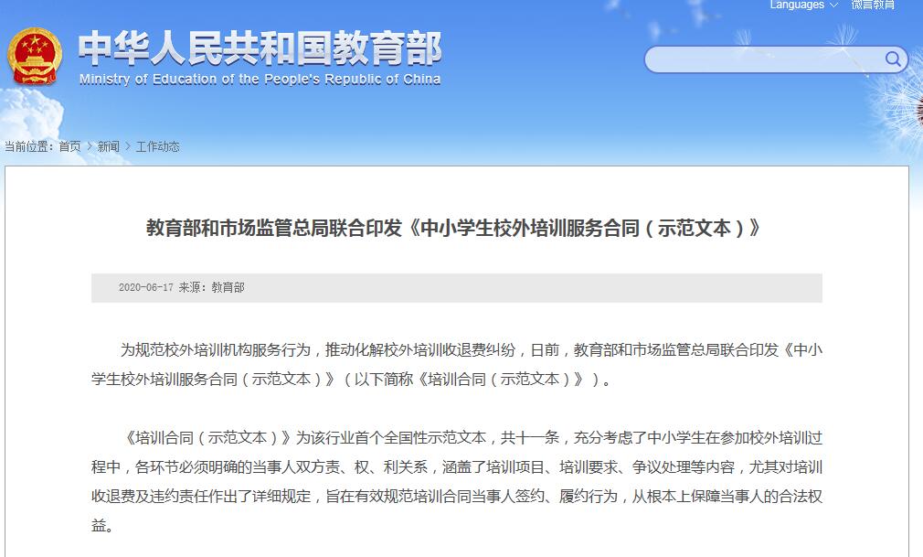 中国网6月18日讯 据教育部网站17日消息,为规范校外培训机构服务行为,推动化解校外培训收退费纠纷,日前,教育部和市场监管总局联合印发《中小学生校外培训服务合同(示范文本)》(以下简称《培训合同(示范文本)》)。
