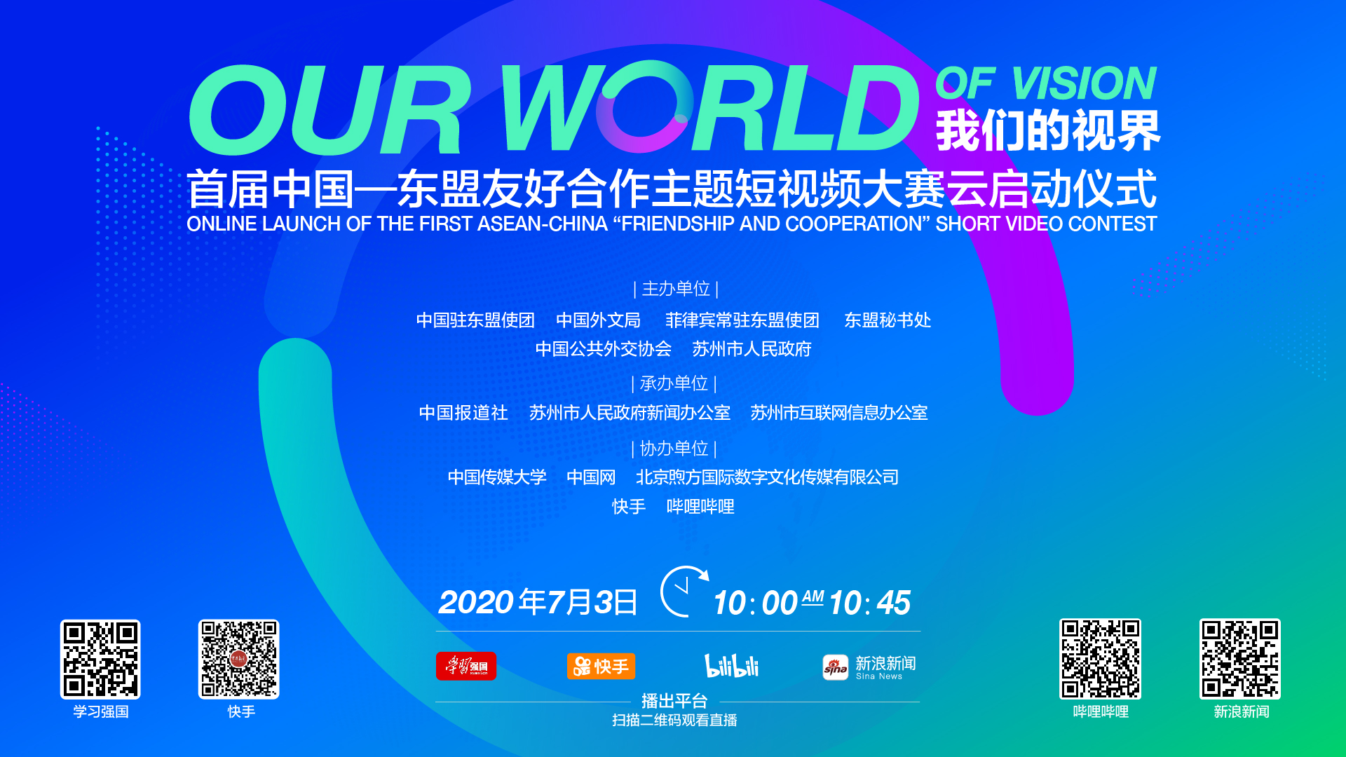 中国网7月3日讯 今日,随着中国和东盟十一国青年代表共同点亮屏幕,“我们的视界”首届中国—东盟友好合作主题短视频大赛正式启动。本次大赛由中国外文局联合中国驻东盟使团、菲律宾常驻东盟使团、东盟秘书处、中国公共外交协会、苏州市人民政府主办,中国报道社、苏州市人民政府新闻办公室、苏州市互联网信息办公室承办,中国传媒大学、中国网、煦方国际、快手、哔哩哔哩等机构协办。