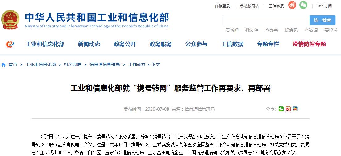 中国网7月8日讯 据工业和信息化部网站今日消息,7月7日下午,为进一步提升“携号转网”服务质量,增强“携号转网”用户获得感和满意度,工业和信息化部信息通信管理局在京召开了“携号转网”服务监管电视电话会议,这是自去年11月“携号转网”正式实施以来的第五次全国监管工作会。