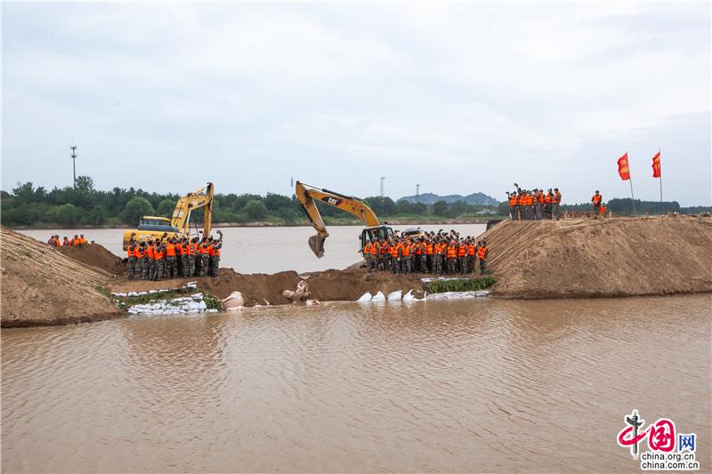 堵复决口成功,抢险队员胜利欢呼。