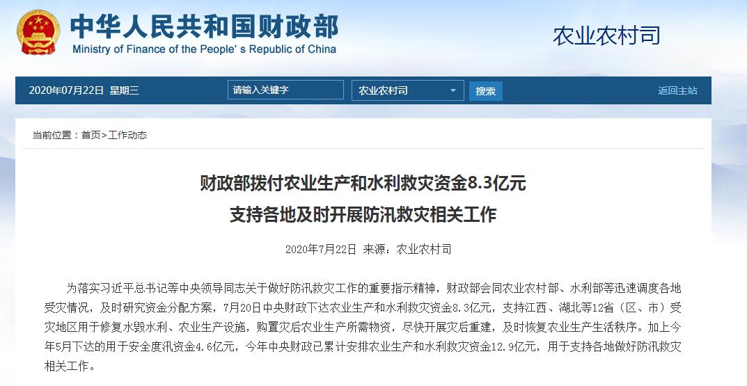 中国网7月22日讯 据财政部网站今日消息,财政部会同农业农村部、水利部等迅速调度各地受灾情况,及时研究资金分配方案,7月20日中央财政下达农业生产和水利救灾资金8.3亿元,支持江西、湖北等12省(区、市)受灾地区用于修复水毁水利、农业生产设施,购置灾后农业生产所需物资,尽快开展灾后重建,及时恢复农业生产生活秩序。