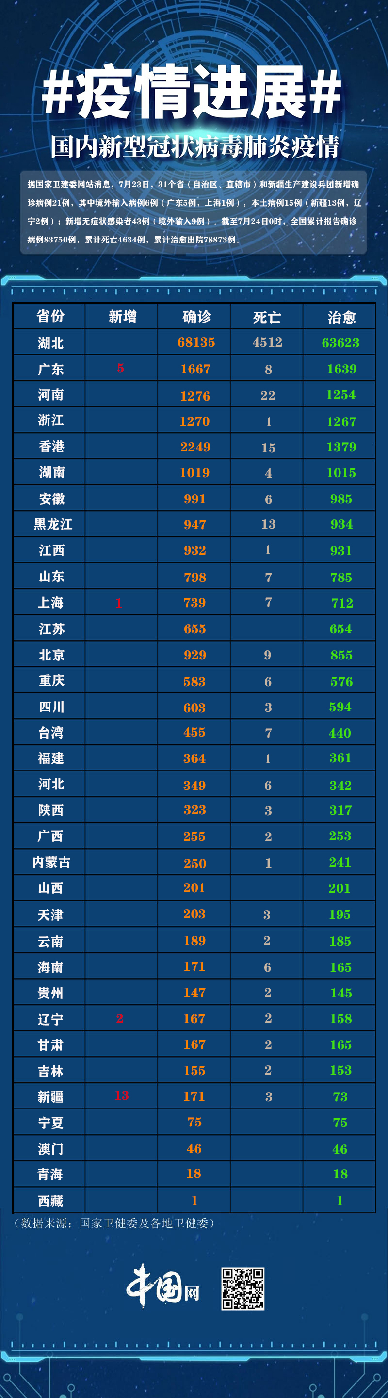 据国家卫建委网站消息,7月23日,31个省(自治区、直辖市)和新疆生产建设兵团新增确诊病例21例,其中境外输入病例6例(广东5例,上海1例),本土病例15例(新疆13例,辽宁2例);新增无症状感染者43例(境外输入9例)。截至7月24日0时,全国累计报告确诊病例83750例,累计死亡4634例,累计治愈出院78873例。