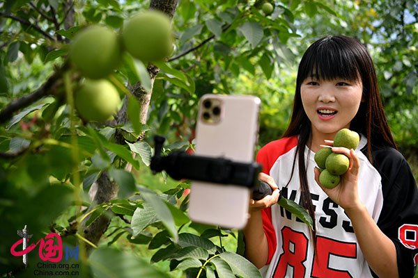 2020年7月20日,陕西,丹凤县的网络主播李萌在当地的万亩核桃园内直播介绍即将上市的核桃。新华社记者 刘潇 摄