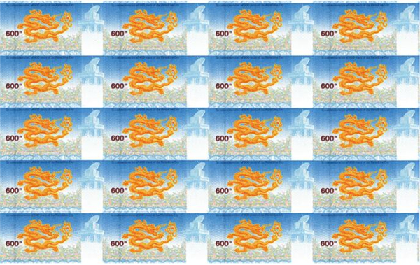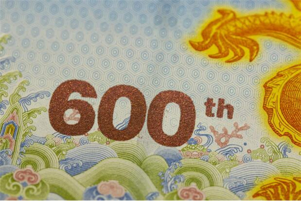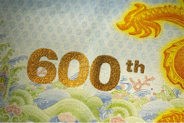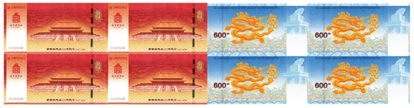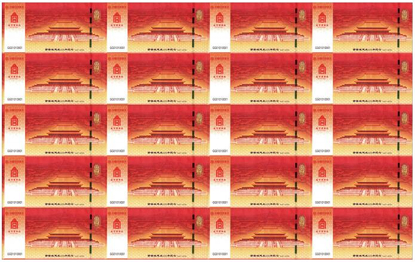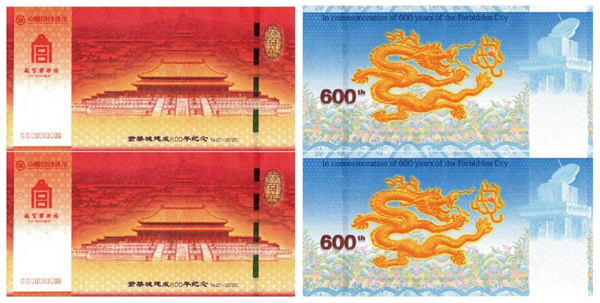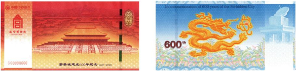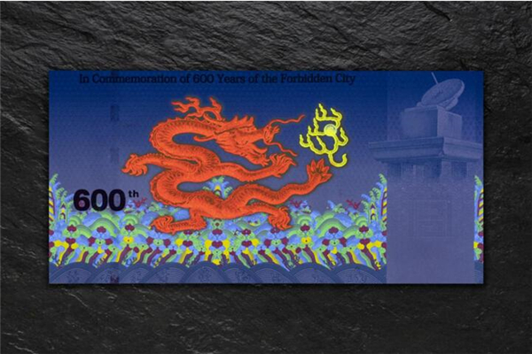 “紫禁城建成600年纪念券” 是故宫博物院与中国印钞造币总公司签署战略协议后合作发行的首款产品。纪念券正面以太和殿为主景,背景辅以紫禁城鸟瞰图,同时展现其雄伟壮观与历史深邃。背面选用九龙壁上的第一条龙为主景图案。三交六椀菱花窗棂、琉璃砖雕、日晷、龟背纹、江崖海水纹等故宫经典元素分布在纪念券的不同位置。