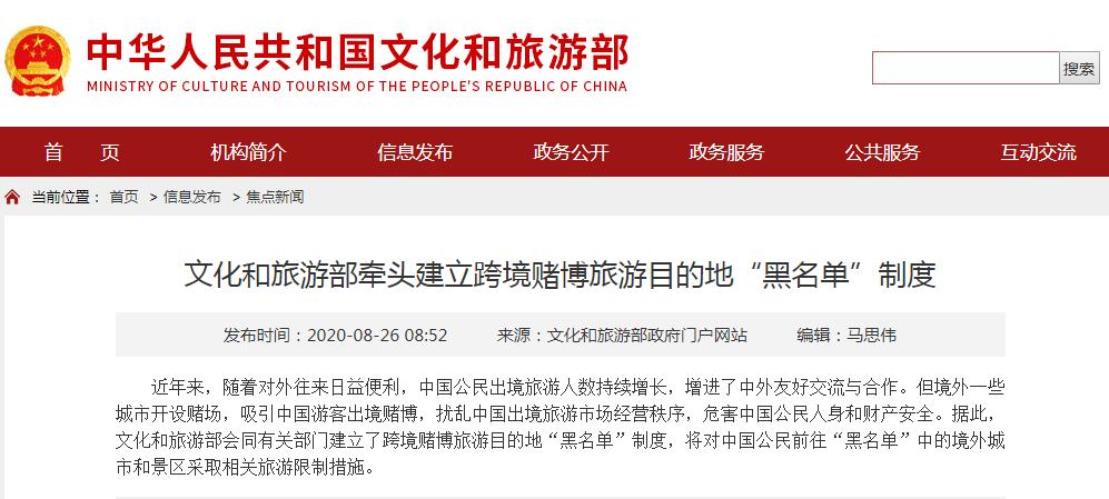 中国网8月26日讯 据文化和旅游部网站今日消息,近年来,随着对外往来日益便利,中国公民出境旅游人数持续增长,增进了中外友好交流与合作。但境外一些城市开设赌场,吸引中国游客出境赌博,扰乱中国出境旅游市场经营秩序,危害中国公民人身和财产安全。据此,文化和旅游部会同有关部门建立了跨境赌博旅游目的地“黑名单”制度,将对中国公民前往“黑名单”中的境外城市和景区采取相关旅游限制措施。