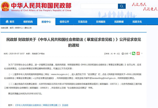 中国网9月8日讯 民政部日前公布《中华人民共和国社会救助法(草案征求意见稿)》,自9月7日至10月7日征求社会各界意见。