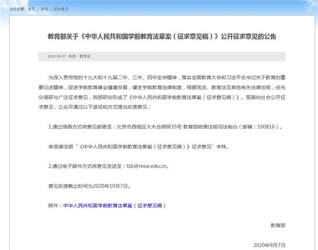 中国网9月8日讯 教育部公布学前教育法草案(征求意见稿),自9月7日起至10月7日向社会公开征求意见。