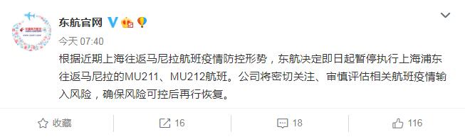 中国网9月18日讯 据中国东方航空股份有限公司官方微博“东航官网”消息,根据近期上海往返马尼拉航班疫情防控形势,东航决定即日起暂停执行上海浦东往返马尼拉的MU211、MU212航班。中国东方航空股份有限公司将密切关注、审慎评估相关航班疫情输入风险,确保风险可控后再行恢复。