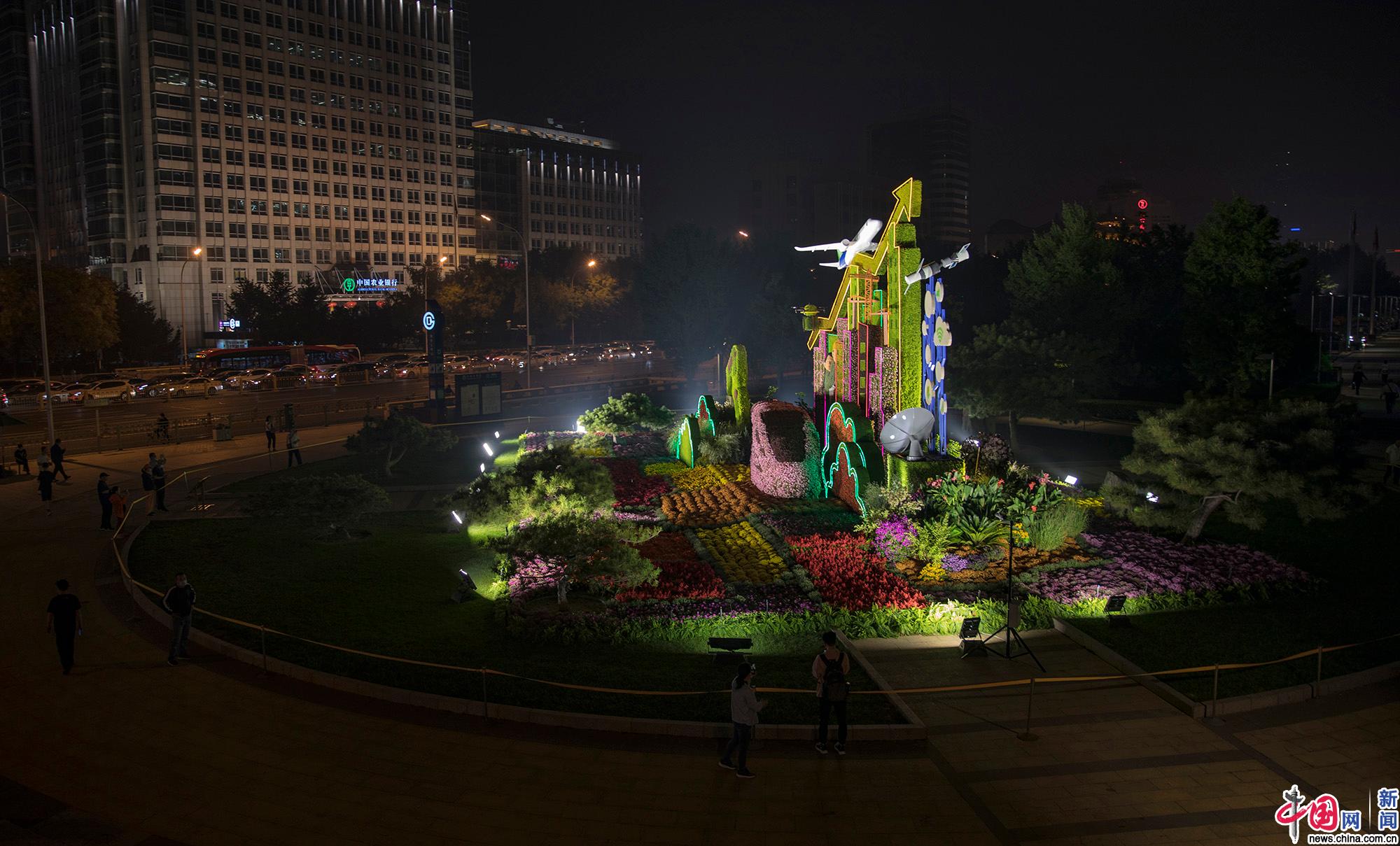 9月28日,北京东单路口东南角“高质量发展”国庆主题花坛在晚间点亮。中国网记者 马旷/摄