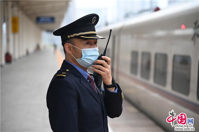 绵阳车务段工作人员发车前与列车长进行安全联控。 邓文鑫 摄