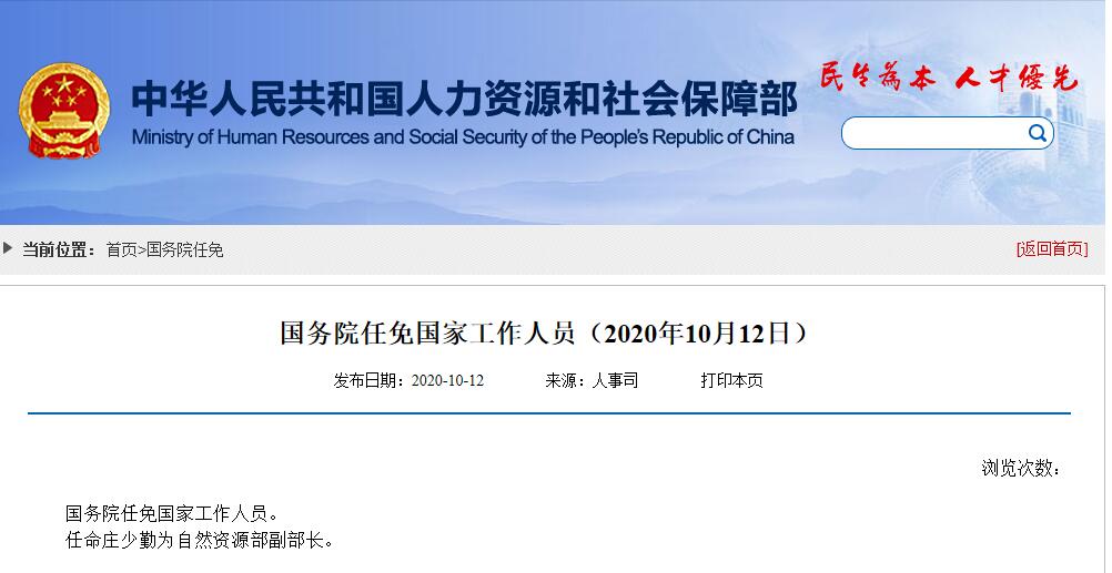 中国网10月12日讯 据人力资源和社会保障部网站今日消息,国务院任免国家工作人员,任命庄少勤为自然资源部副部长。