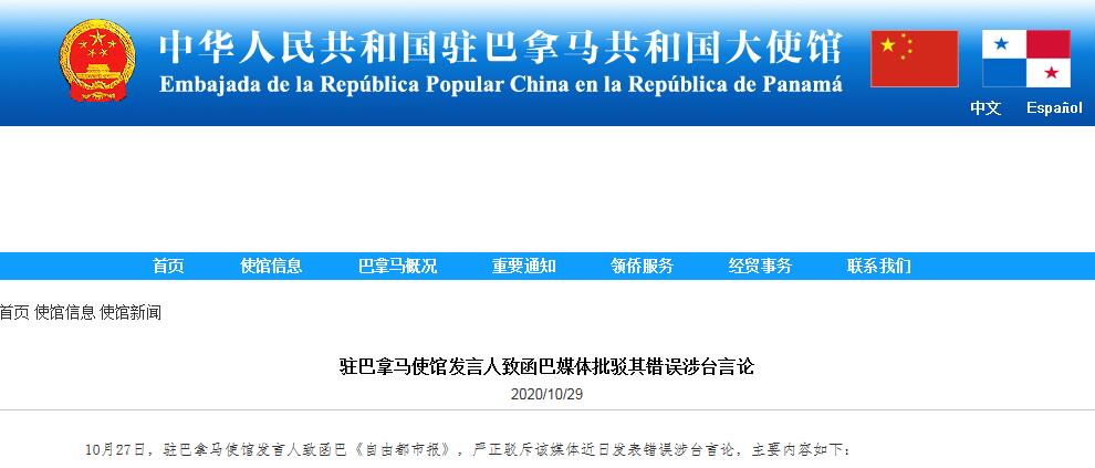 中国网10月29日 据中国驻巴拿马使馆网站消息,10月27日,驻巴拿马使馆发言人致函巴《自由都市报》,严正驳斥该媒体近日发表错误涉台言论,主要内容如下: