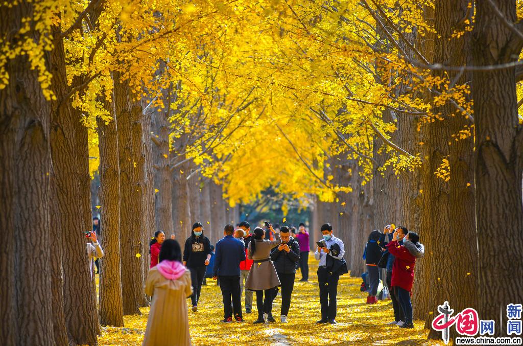 北京:钓鱼台国宾馆外银杏林一片金黄吸引市民打卡