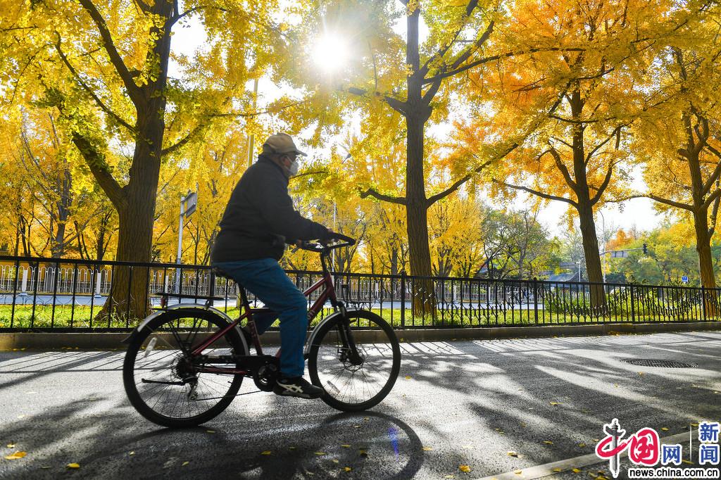 北京:钓鱼台国宾馆外银杏林一片金黄吸引市民打卡